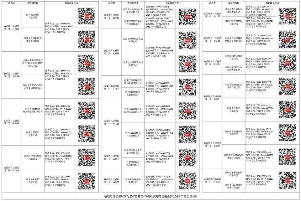 本报讯(记者 金京艺)根据省委关于巡视工作的统一部署,截至11月4日,十一届省委第九轮巡视完成进驻工作。16个省委巡视组将对30户省管企业开展常规巡视。被巡视单位分别召开巡视进驻动员会。各省委巡视组组长作动员讲话,对学习贯彻习近平总书记关于巡视工作、关于河南工作的重要论述以及在河南考察时重要讲话精神,认真落实省委工作部署,为顺利完成本轮巡视任务做好思想准备、组织准备、工作准备提出要求。各省委巡视组组长指出,巡视是全面从严治党的战略性制度安排。被巡视党组织和党员干部要不断提高政治判断力、政治领悟力、政治执行力,深刻认识对省管企业开展巡视是毫不动摇落实“两个一以贯之”,坚持和加强党对国有企业全面领导的重要举措,是深入贯彻落实习近平总书记关于河南工作重要论述、落实“两高四着力”重大要求、奋力谱写中原大地推进中国式现代化新篇章的重要举措,是全面落实党的二十届三中、四中全会精神,推动国资国企改革任务落地见效的重要举措,是坚决扛起全面从严治党责任、推动省管企业形成风清气正的政治生态的重要举措,增强使命感责任感,在服务保障党和国家工作全局、贯彻落实省委工作部署要求中发挥更大作用。各省委巡视组组长要求,要全面贯彻巡视工作方针,坚守政治巡视定位,准确把握省管企业特点,聚焦党委领导班子特别是“一把手”开展监督,重点了解坚持和加强党对国有企业全面领导,聚焦主责主业推动高质量发展,深化国资国企改革,防范化解重大风险,推进省管企业全面从严治党,加强领导班子、干部人才队伍和基层党组织建设,落实巡视等监督发现问题整改和成果运用等情况。被巡视党组织要展现政治担当、强化协作配合、严格纪律作风,共同完成好省委赋予的政治任务。据悉,各省委巡视组将在被巡视单位工作2个月左右,其间设立专门值班电话、接收短信手机、邮政信箱、“码上巡”等信访举报方式,主要受理反映被巡视党组织领导班子及其成员、下一级党组织主要负责人和重点岗位人员问题的来信来电来访,重点是关于违反政治纪律、组织纪律、廉洁纪律、群众纪律、工作纪律和生活纪律等方面的举报和反映。省委巡视组受理信访时间截止到2025年12月24日。十一届省委第九轮巡视进驻一览表
